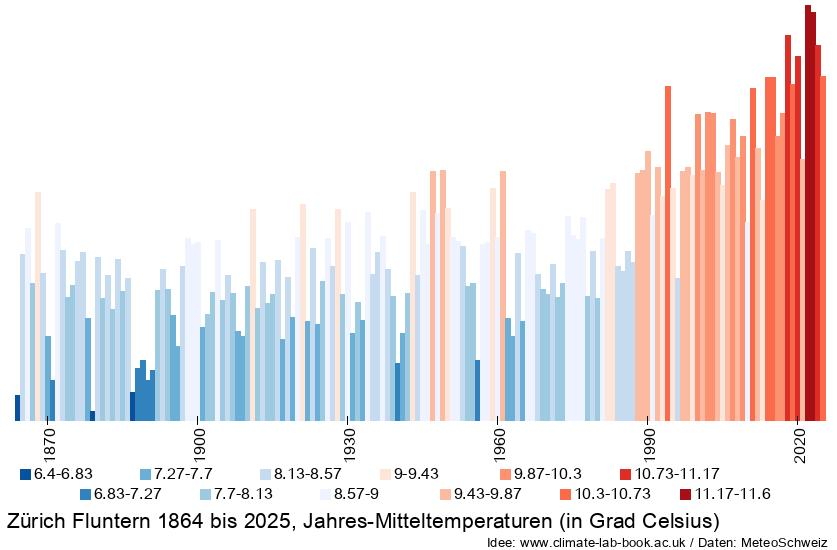 Für diverse Messstationen wurden am 2. Januar 2026 die Daten zu den Jahresmitteltemperaturen aktualisiert. Damit kann zum Beispiel für Zürich Fluntern ein Temperaturstreifen für die verfügbaren Messdaten 1864 bis 2025 berechnet werden: